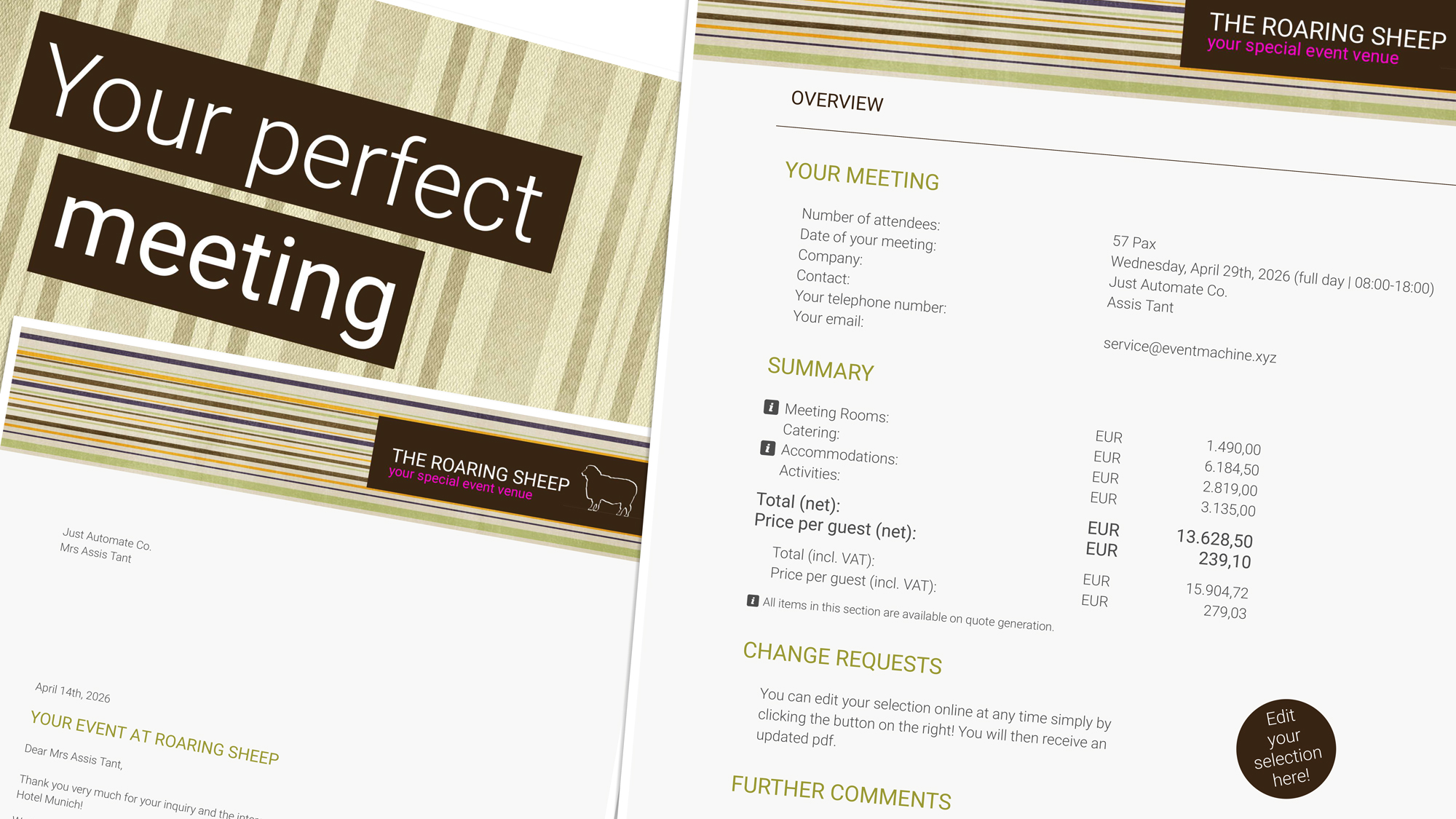 Eventmachine provides cloud software for online event planning and automated quoting. Designed to automate and simplify sales processes, Eventmachine's MICE tools help hotels and venues quote faster, ensure quote accuracy, and maximize revenue. Seamlessly integrated into hotels' and venues' websites and tech stacks, its solution offers instant, error-free event quotes and support efficient event execution.